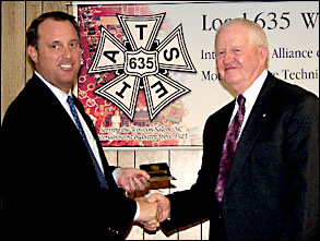 Photos were taken and lots of hands offered to Brother Morgan who over the years has offered to the local his experience, friendship and service to 635 as both Vice-President and President. After the presentation International President Short swore in new member Patrick Hajduk to Local 635, spoke to the membership about the present status of the IATSE, and openly answered questions from the membership.